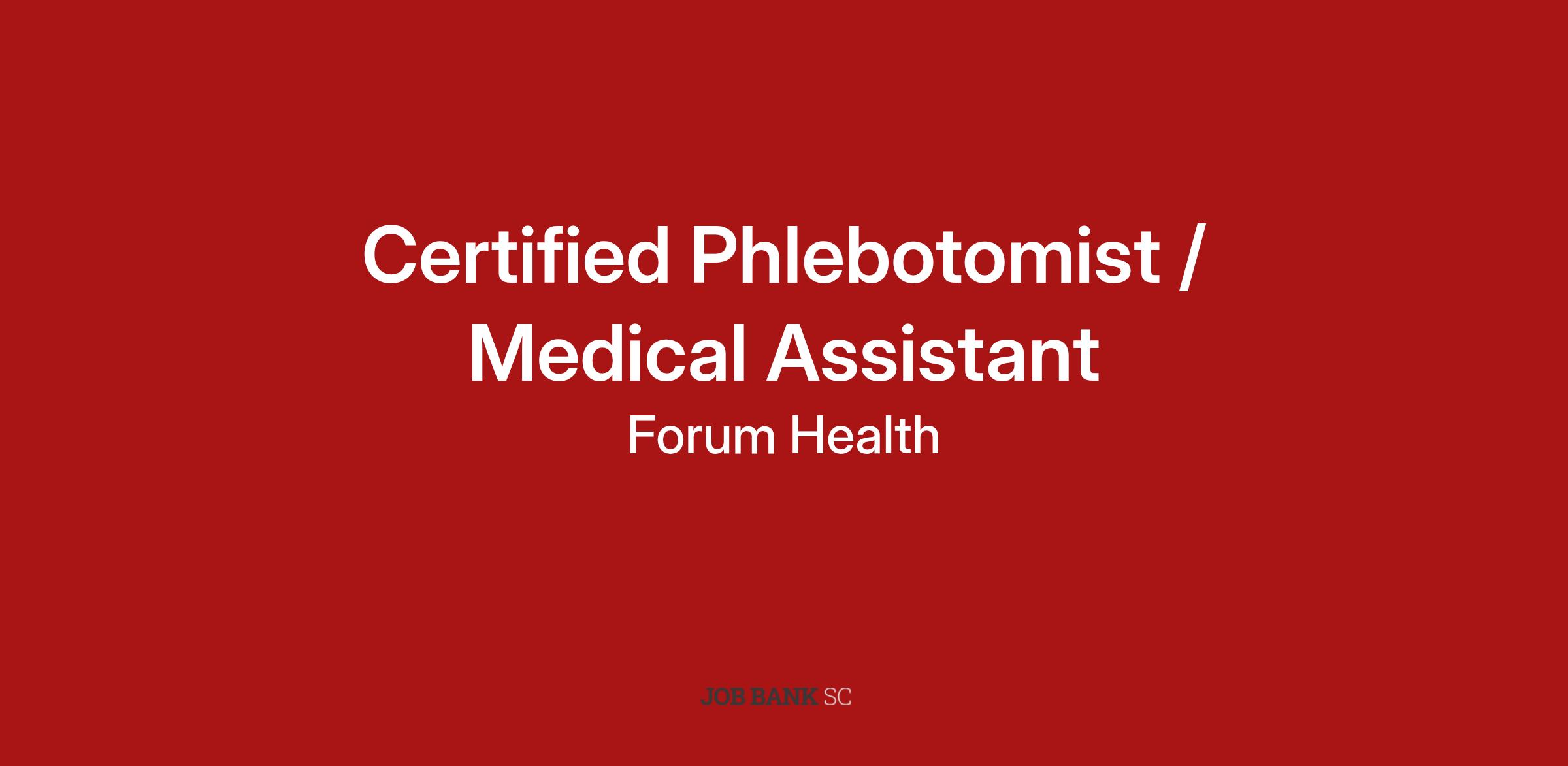 Forum Health LLC is excited to announce we are currently hiring a Full time Phlebotomist/Medical Assistant. We are looking for an energetic and organized Medical Assistant to join our team. This job requires great attention to detail and great organizational skills. It is also important that you have great communication skills and work well with others.