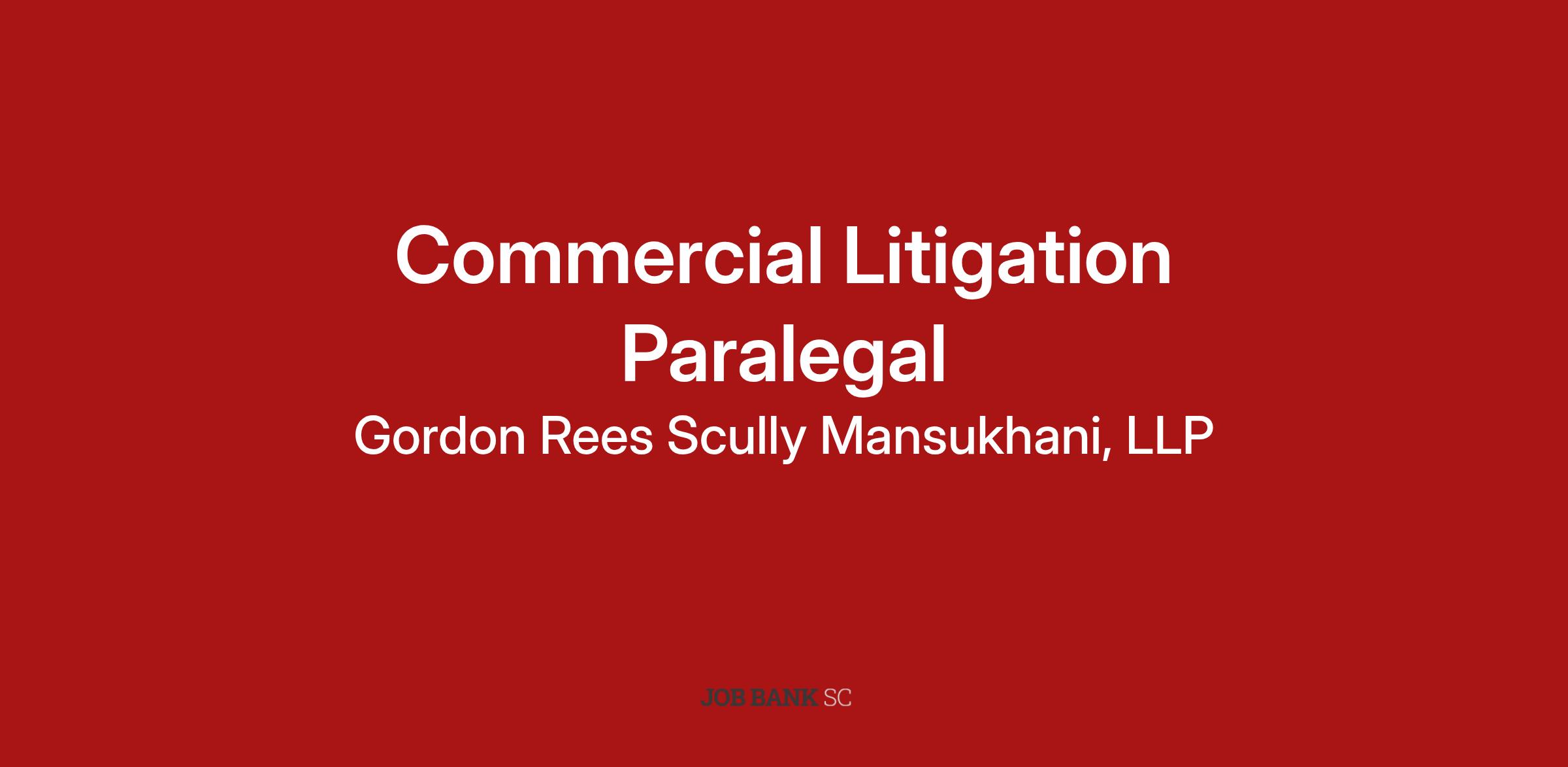 Gordon Rees Scully Mansukhani, a national law firm with offices in all 50 States, has an immediate opening for an experienced Commercial Litigation Paralegal in its Charleston office. The ideal candidate must have five or more years of experience working as a litigation-focused paralegal, preferably in a large law firm setting.