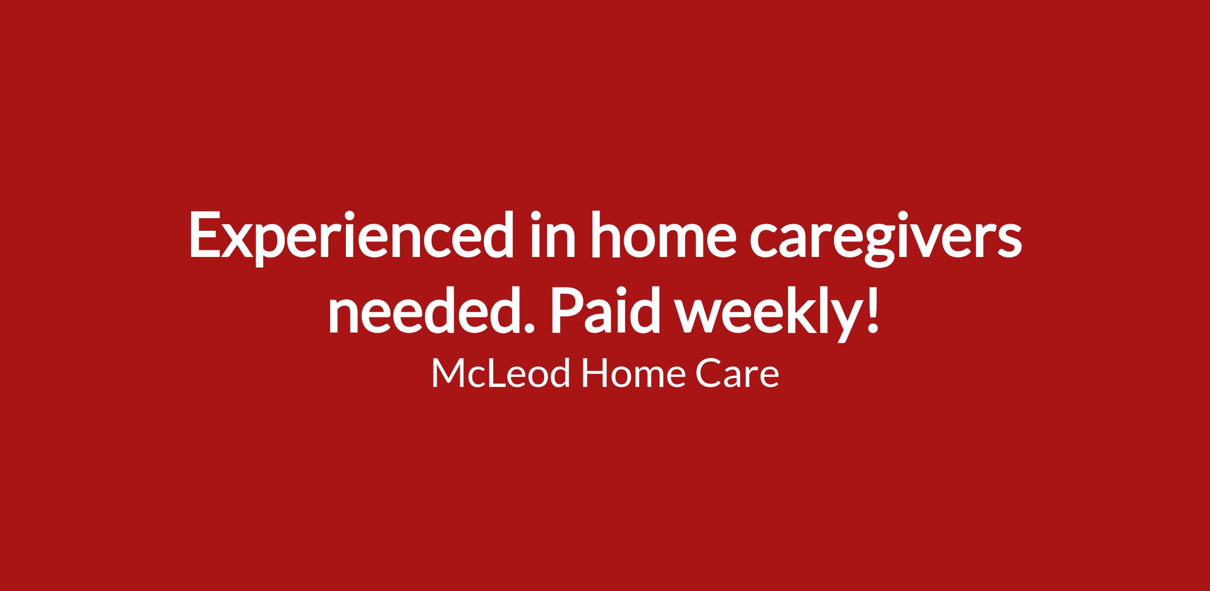 McLeod Home Care is a non-medical home care agency looking for experienced, caring, and compassionate Care Professionals! We have great appreciation for those who put their heart and soul into this work. Apply now to see why 60% of our Care Professionals are referred by our current staff of Care Professionals!