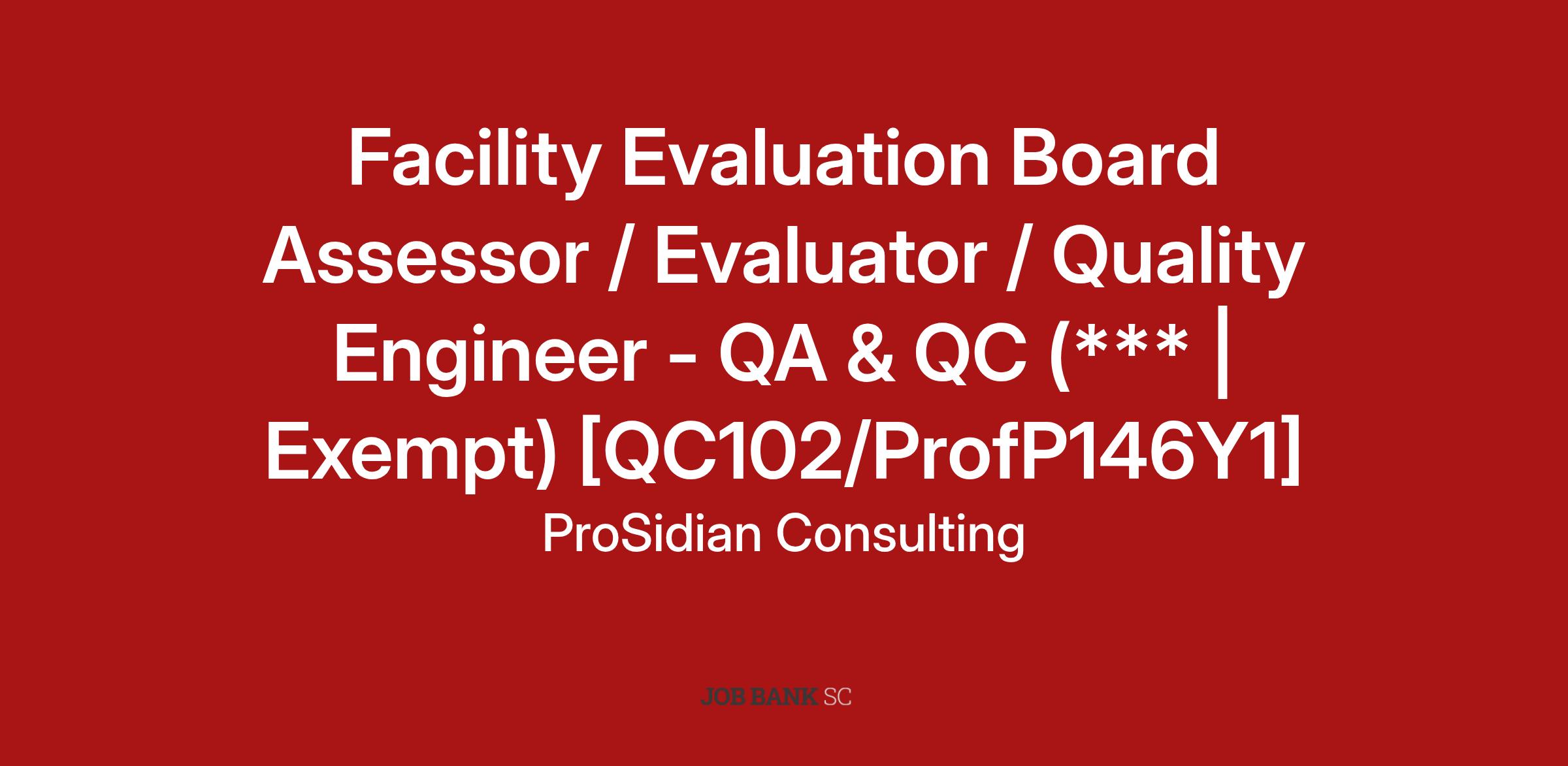 Facility Evaluation Board Assessor / Evaluator / Quality Engineer - QA & QC Candidates shall work to support requirements for 0 and The Facility Evaluation Board Assessor / Evaluator / Quality Engineer QA QC 102 is a Professional Grade position.