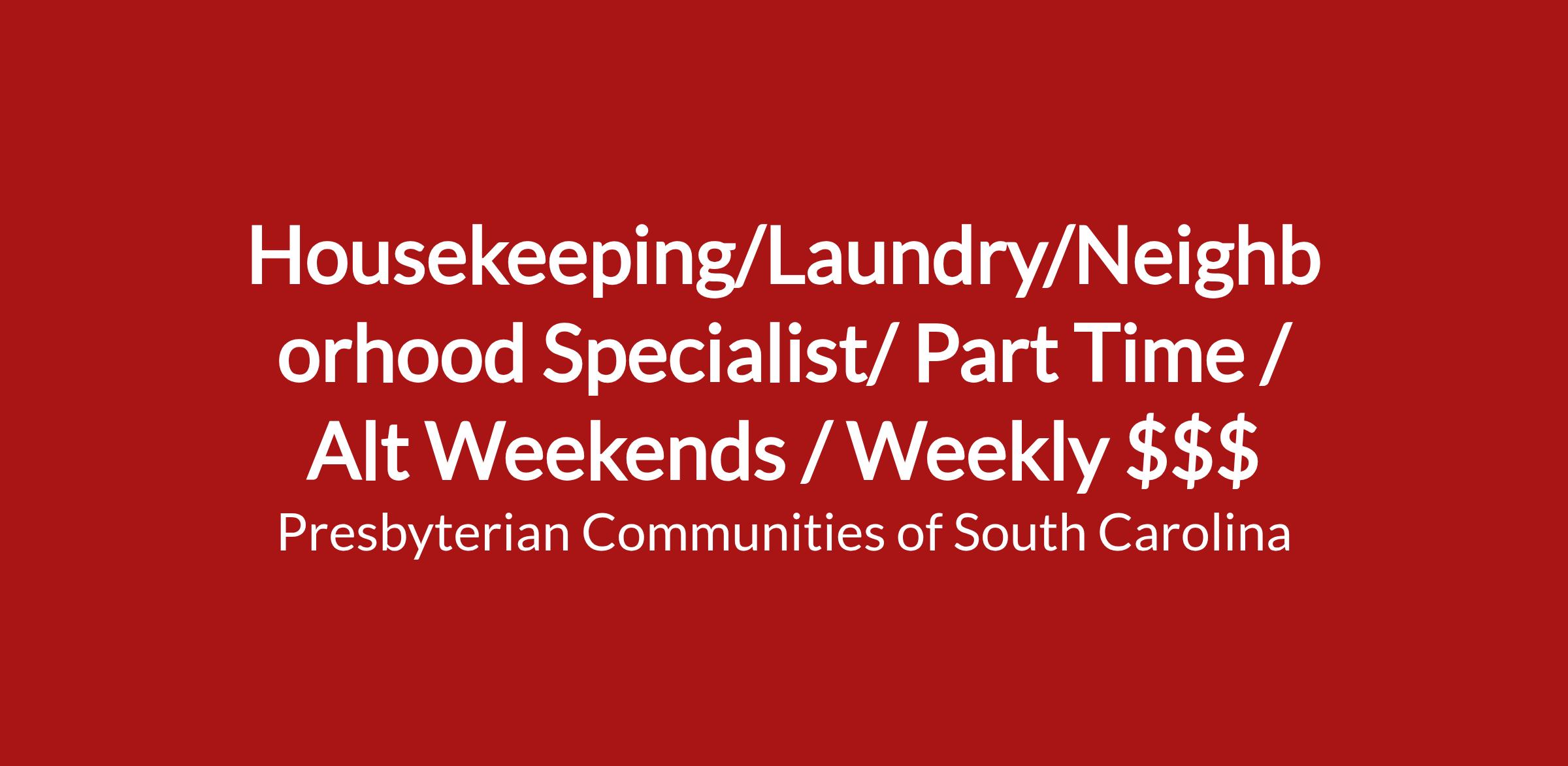 Our Housekeeping/Laundry (Neighborhood Specialist) position ensures resident rooms and common areas are clean, sanitary, and inviting. Β Β We are currently seeking a dedicated, service-minded and detail-oriented individual to join our team. Β This position has a significant and meaningful impact on the lives of our residents, staff and visitors by creating a safe, warm and welcoming environment.
