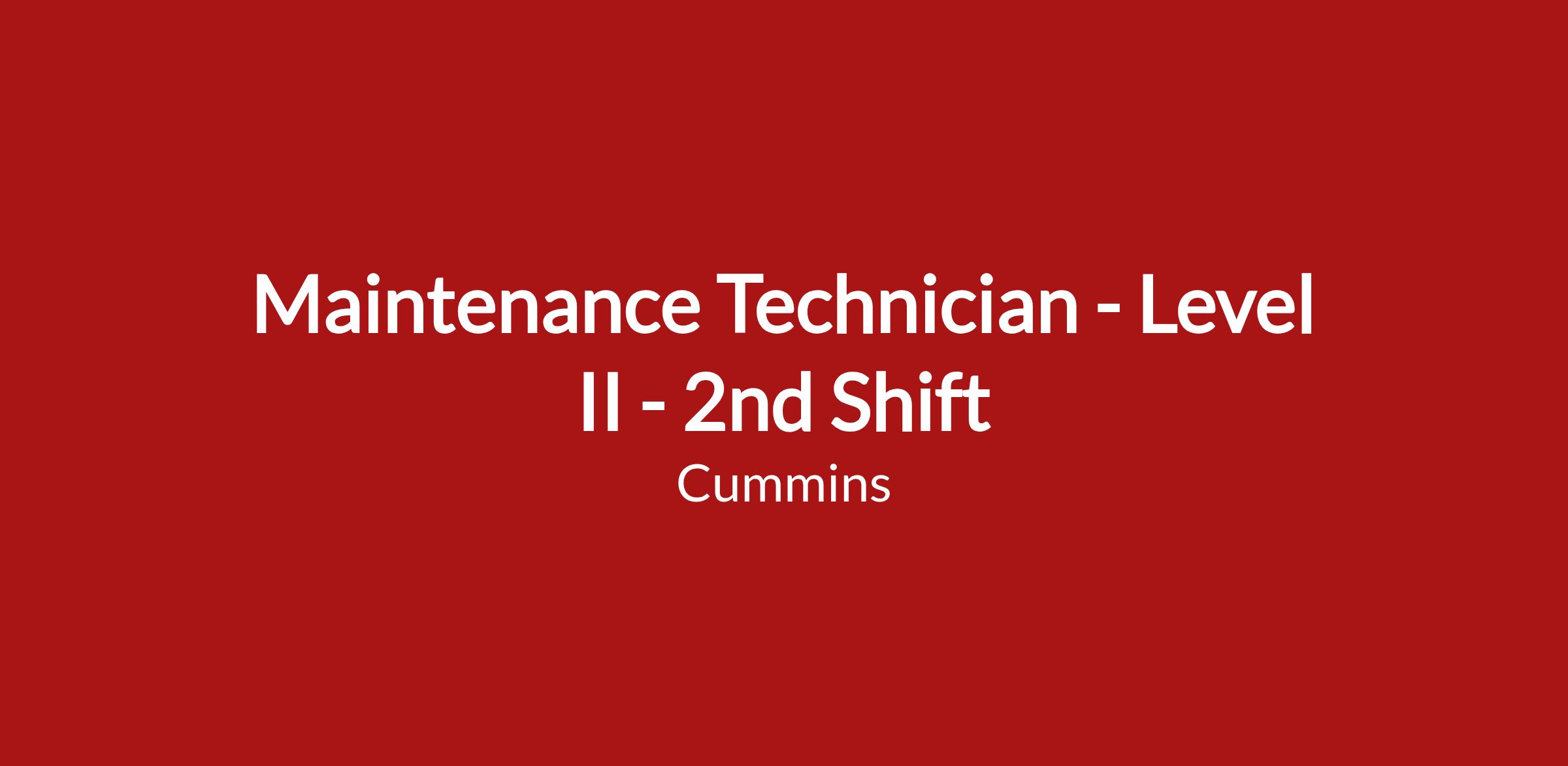 DescriptionWe are looking for a talented Maintenance Technician – Level II (2nd Shift) to join our team specializing in Manufacturing for our Cummins Inc. facility in North Charleston, SC.