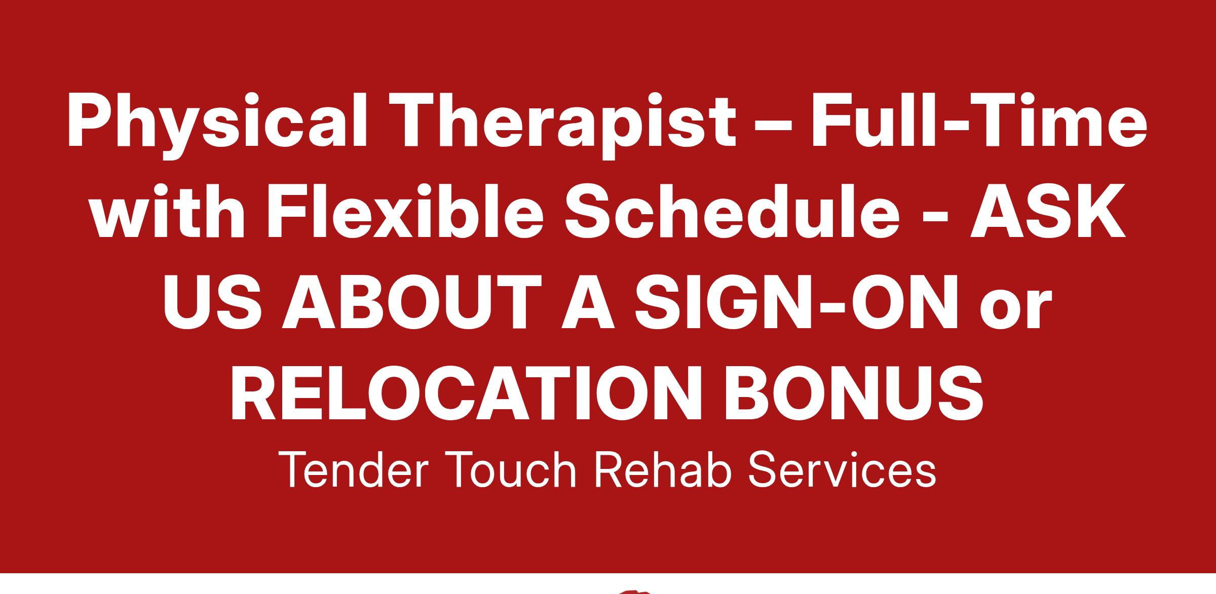 Tender Touch Rehab is hiring! We are looking for a passionate full-time Physical Therapist to join our growing team. In the same way that you are committed to quality work, we are equally dedicated to helping you grow and succeed with us.