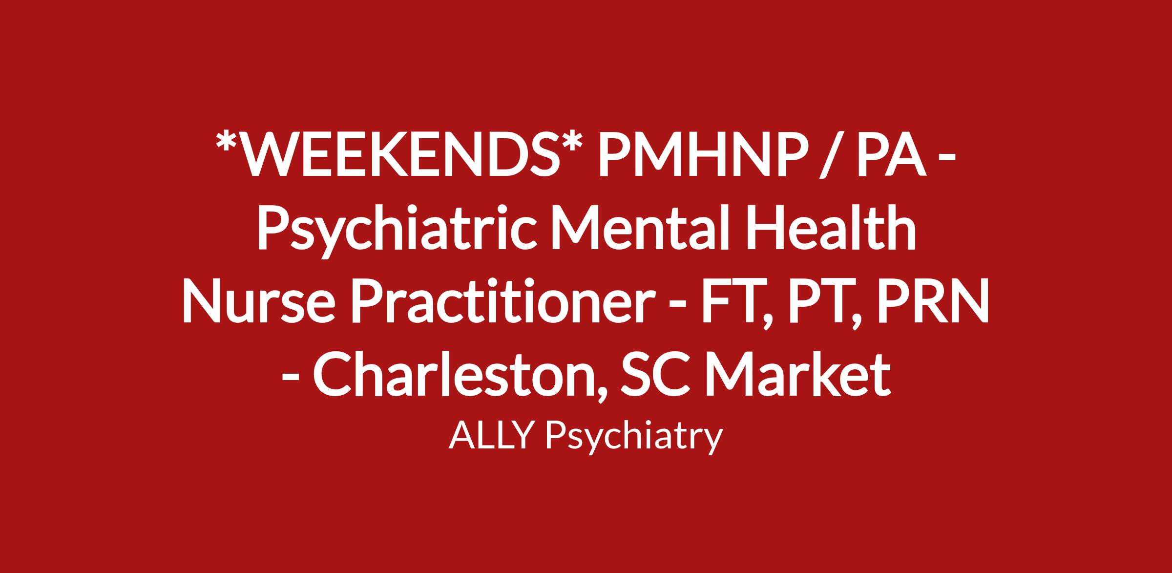 Ally Psychiatry is seeking Full-Time, Part-Time, and PRN providers to join our growing team in beautiful Charleston, SC. This opportunity, affectionately known as our βWeekend Warriorβ role, is designed with flexibility in mind and can be tailored to fit your ideal schedule and lifestyle.